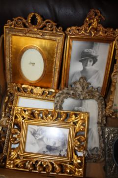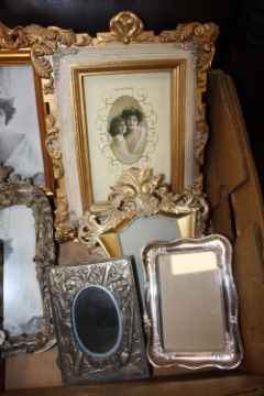 A TRAY OF MOSTLY MODERN SMALL DECORATIVE PICTURE FRAMES TO INCLUDE GILT FRAMED EXAMPLES