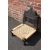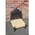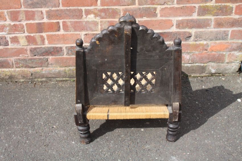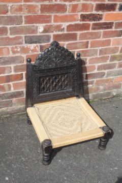 AN UNUSUAL EBONISED TRIBAL LOW STOOL / SEAT, the carved and pierced folding hinged back, above a wicker seat, raised on four turned feet, overall H 75, W 57 cm