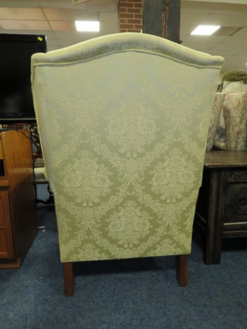 A MODERN UPHOLSTERED WING ARMCHAIR - A/F STAINED TO THE SEAT