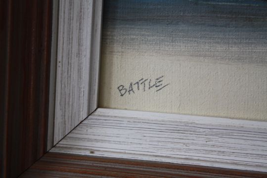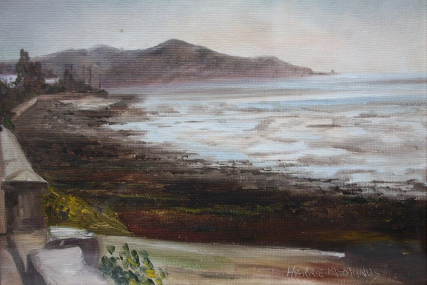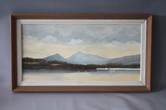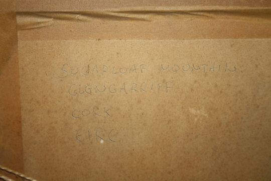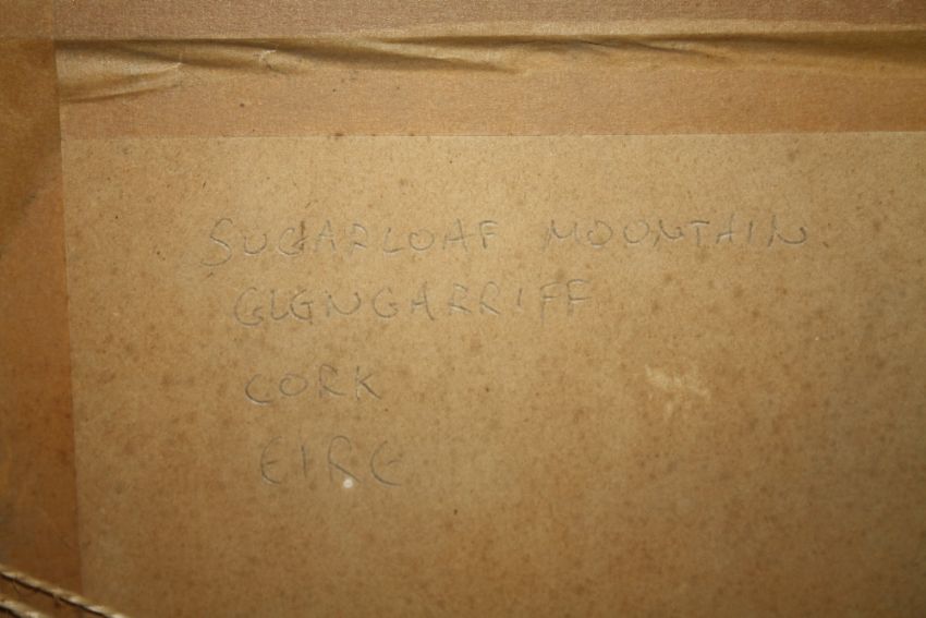 HARRY McMANUS (XX) IRISH SCHOOL. 'Evening Sky, Howth Head, Dublin', see verso, signed lower right, oil on board, framed and glazed, 20 x 23 cm, together with BATTLE (XX) Irish School 'Sugarloaf Mountain, Glengarrif, Cork' see verso, signed lower left, oil on board, framed, 28 x 59 cm (2)