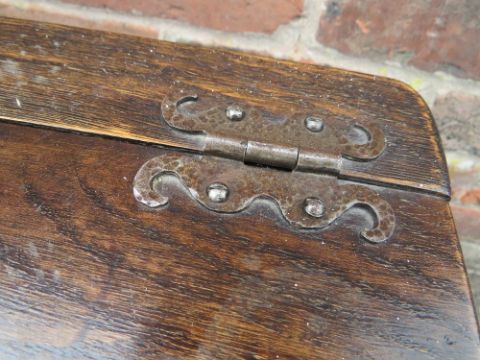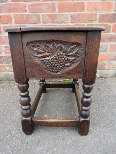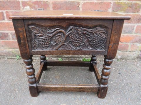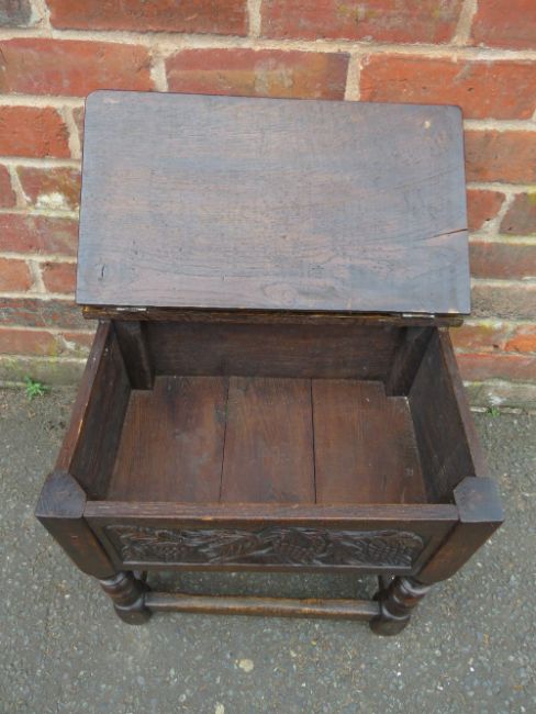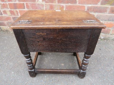 A SMALL CARVED OAK SEWING BOX RAISED ON BOBBIN TURNED SUPPORTS, H-46 W-48 CM