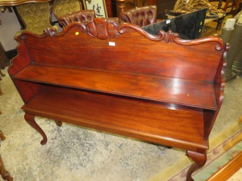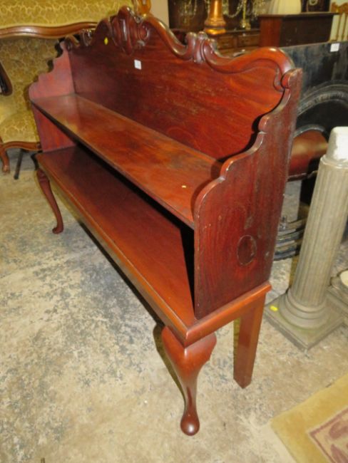 AN ANTIQUE MAHOGANY OPEN BOOKCASE RAISED ON CABRIOLE SUPPORTS H-109 W-139 CM
