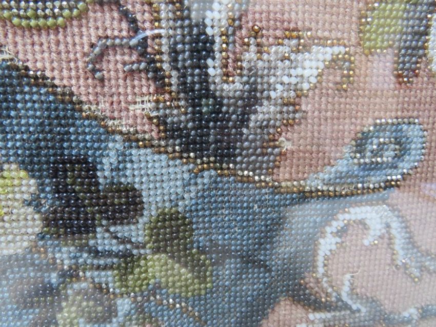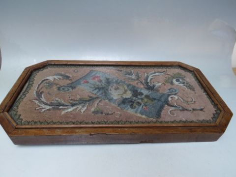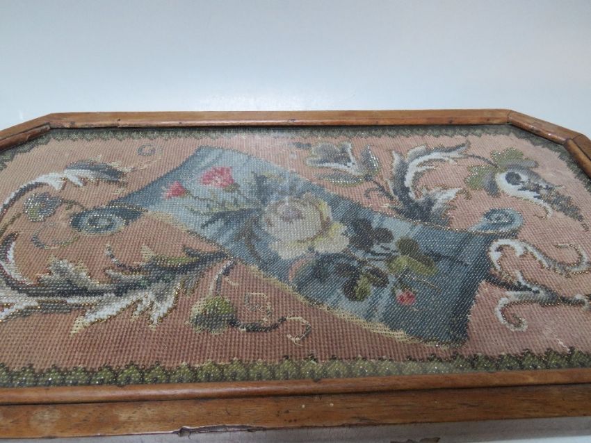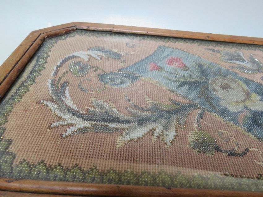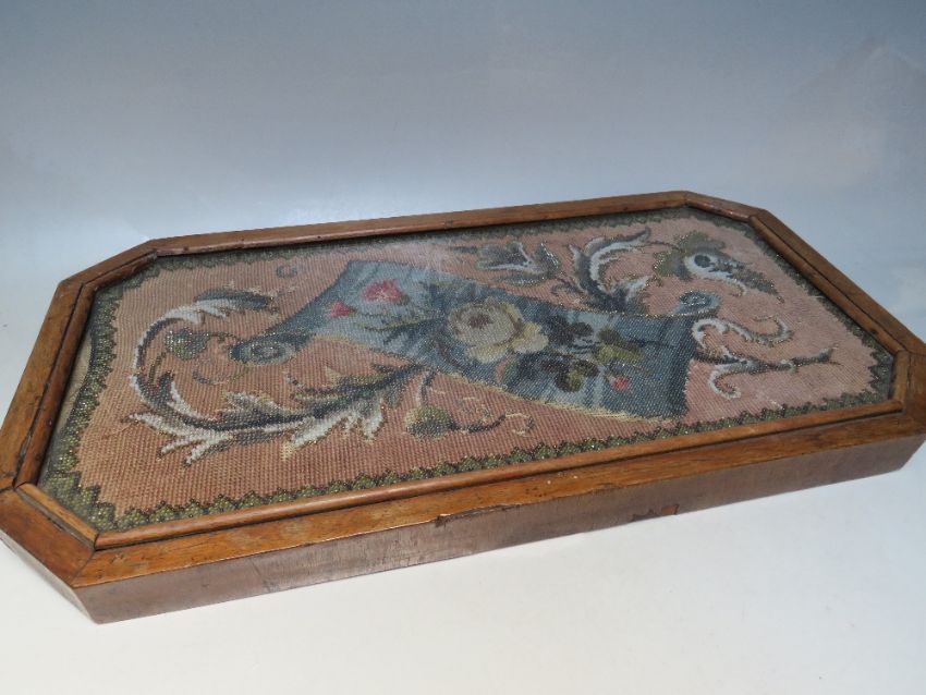 A LATE 19TH / EARLY 20TH CENTURY DECORATIVE BEADWORK TRAY, the rectangular wooden frame with canted corners, glazed to the beadwork panel, L 50.7 cm, D 27 cm, H 3.5 cm