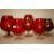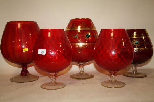 A COLLECTION OF FIVE DECORATIVE LARGE RED GLASS VASES ON STANDS, TALLEST H. 33 CM