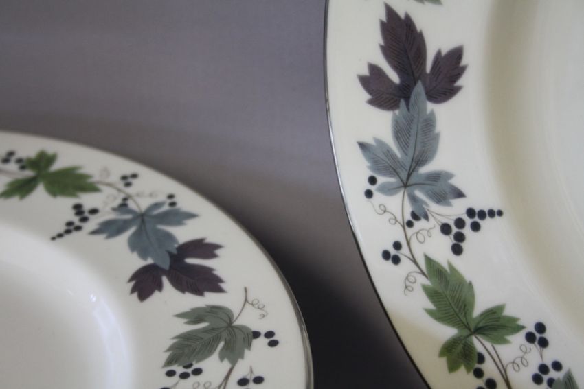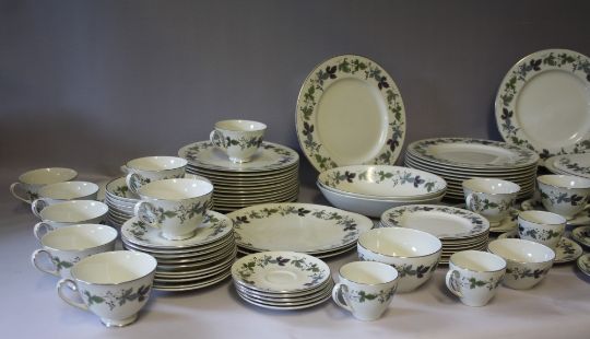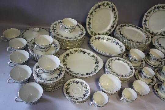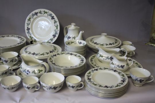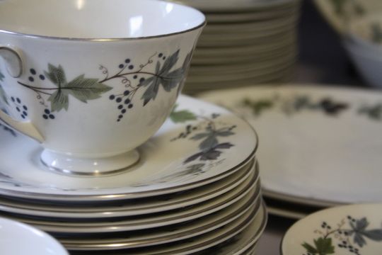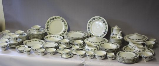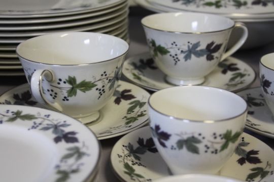 A LARGE COLLECTION OF ROYAL DOULTON 'BURGUNDY' PATTERN TEA AND DINNERWARE, comprising 12 tea cups, 12 saucers, 8 coffee cans, 8 saucers, 1 lidded coffee pot, 1 milk jug, 2 sugar bowls, 2 larger sugar type bowls, 8 soup bowls, 12 fruit bowls, 8 dessert bowls, 2 cake plates, 8 tea plates Dia. 17 cm, 8 side plates Dia. 20 cm, 12 salad plates Dia. 23 cm, 12 dinner plates Dia. 27 cm, 2 gravy boats and 1 stand, 3 lidded tureens, 2 vegetable dishes, 1 large oval platter (125)