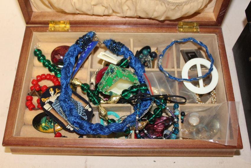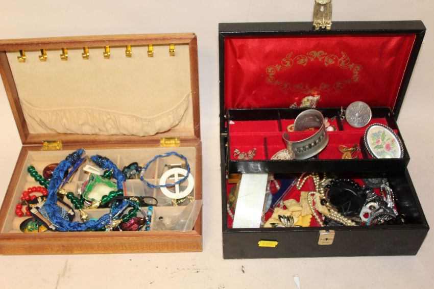 TWO JEWELLERY BOXES CONTAINING COSTUME JEWELLERY TO INCLUDE A DANISH PEWTER BANGLE, VINTAGE BROOCHES ETC.