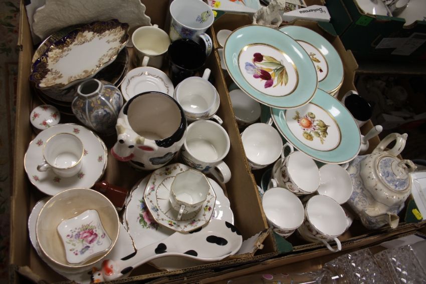 TWO TRAYS OF ASSORTED CHINA AND CERAMICS TO INCLUDE AN ANTIQUE ROYAL DOULTON CABINET PLATE, HAND PAINTED FLORAL PLATES ETC.