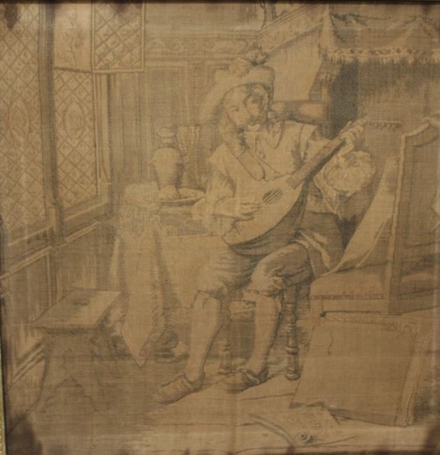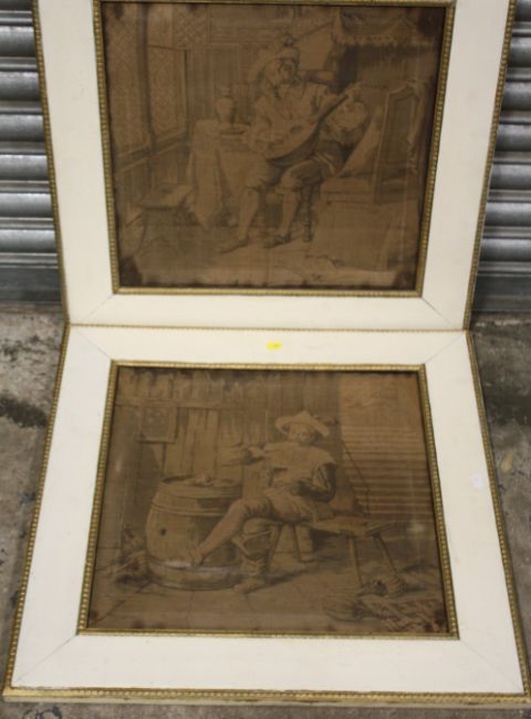 A PAIR OF ANTIQUE FRAMED FIGURATIVE TAPESTRIES, approx 48.5 x 48.5 cm