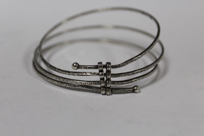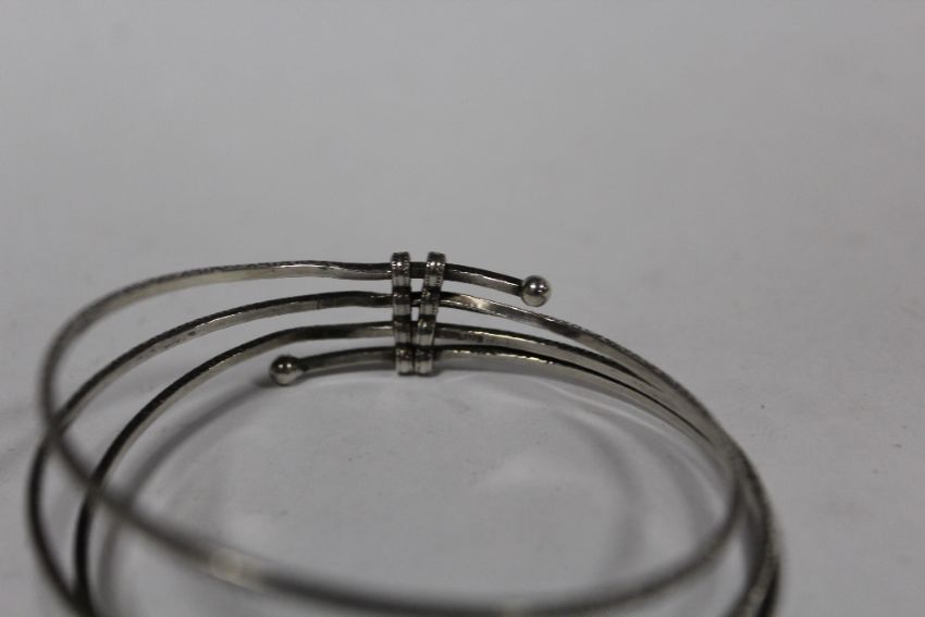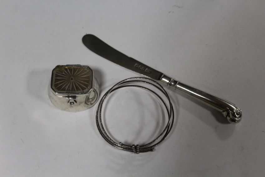A SILVER CUT GLASS LIDDED TRINKET POT STAMPED 925 TO INTERIOR A/F, TOGETHER WITH A DESIGNER STYLE STERLING SILVER BANGLE AND A HALLMARKED SILVER BLADED BUTTER KNIFE (3)
