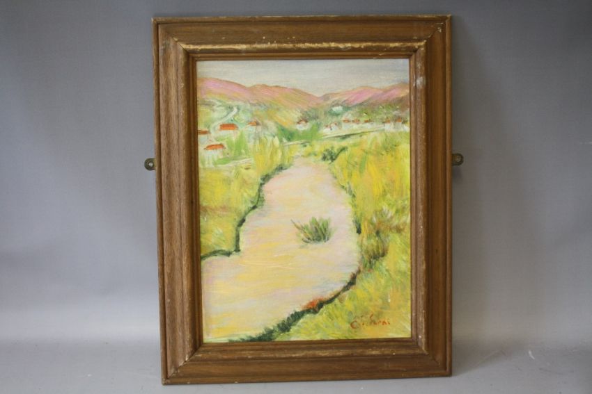 SARDI (XX). Continental school, impressionist mountainous river landscape with village, signed lower right, oil on canvas board, framed, 43 x 32 cm