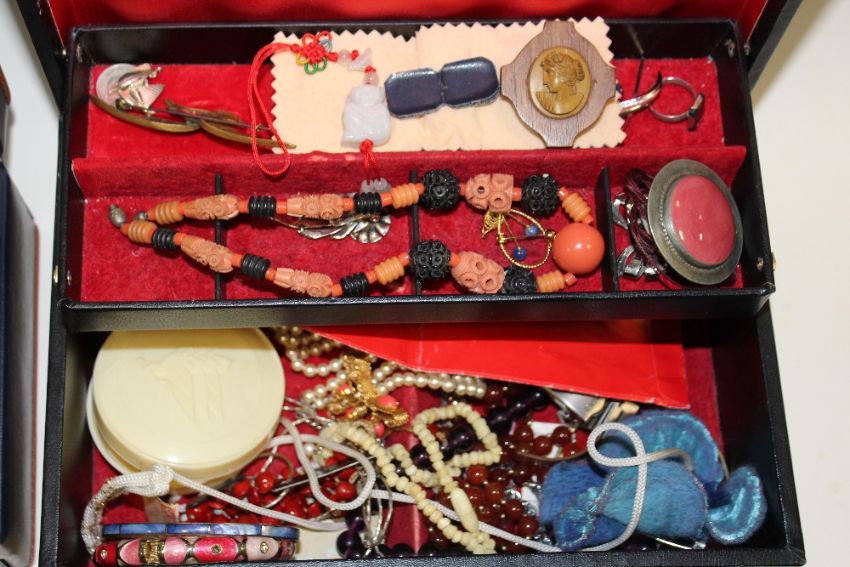 TWO JEWELLERY BOXES CONTAINING COSTUME JEWELLERY TO INCLUDE A CARVED CORAL NECKLACE, AGATE BEAD NECKLACE ETC.