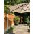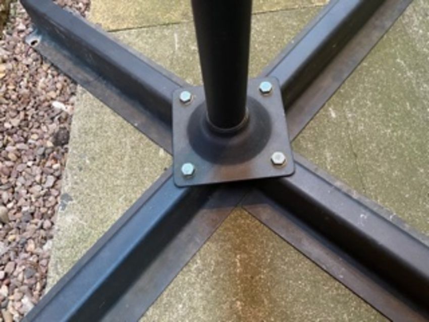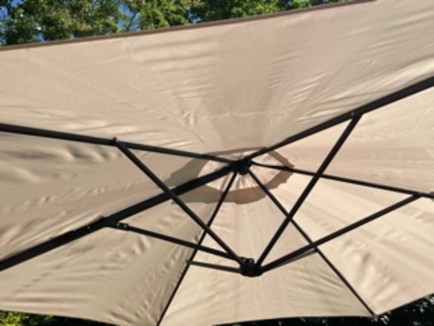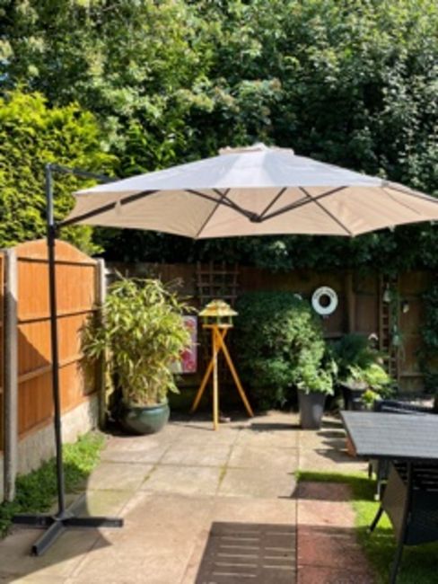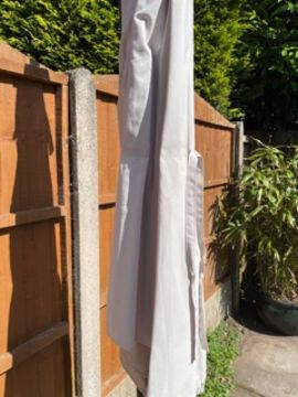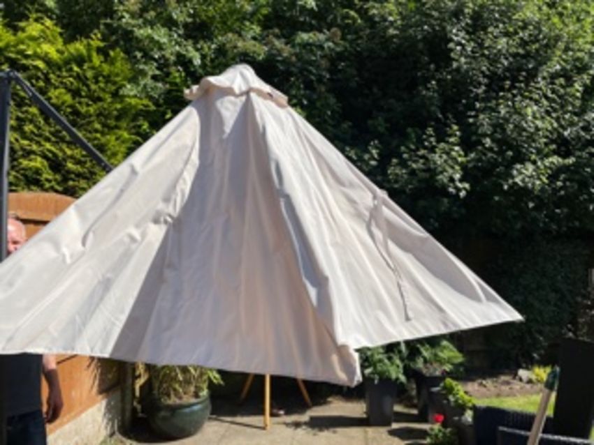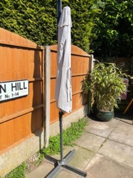 A LARGE GARDEN PARASOL WITH STAND - USED CONDITION