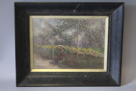 (XIX-XX). Ornamental garden scene with seated figure, indistinctly signed lower right, oil on canvas, framed and glazed, 24 x 34 cm