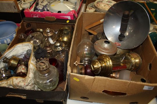 TWO TRAYS OF OIL BURNING LAMPS AND PARTS TO INCLUDE A BIALADDIN BOWL FIRE, SMALL EXAMPLES ETC.