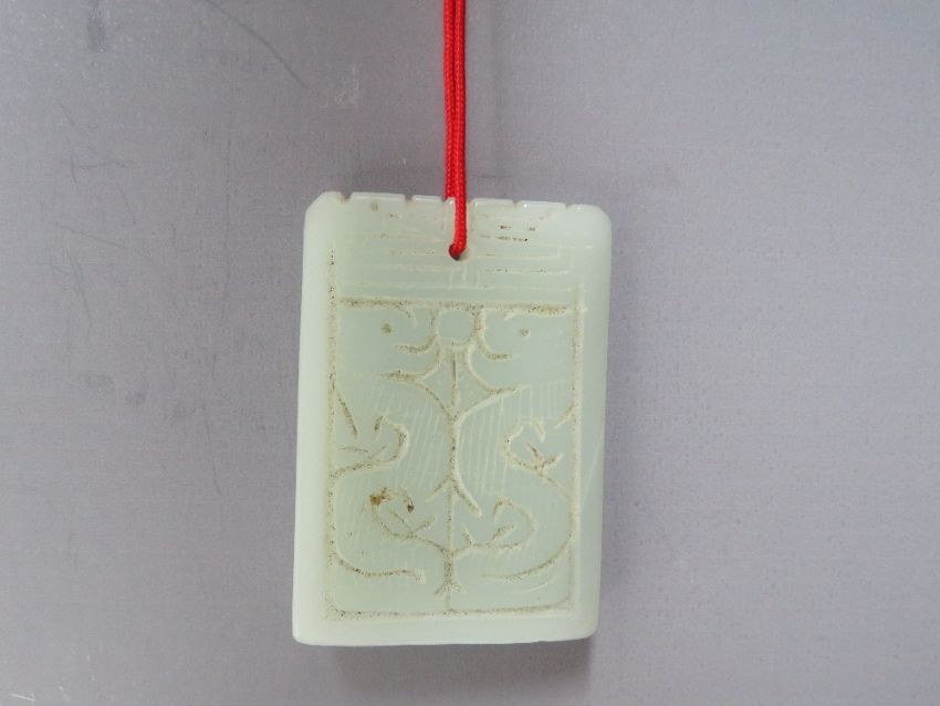 A CHINESE JADE CARVED AND PIERCED FIGURAL PENDANT, W 5.8 cm together with a rectangular pendant with mythical animal embellishment to both sides 4.8 x 3.3 x 0.5 cm (2)