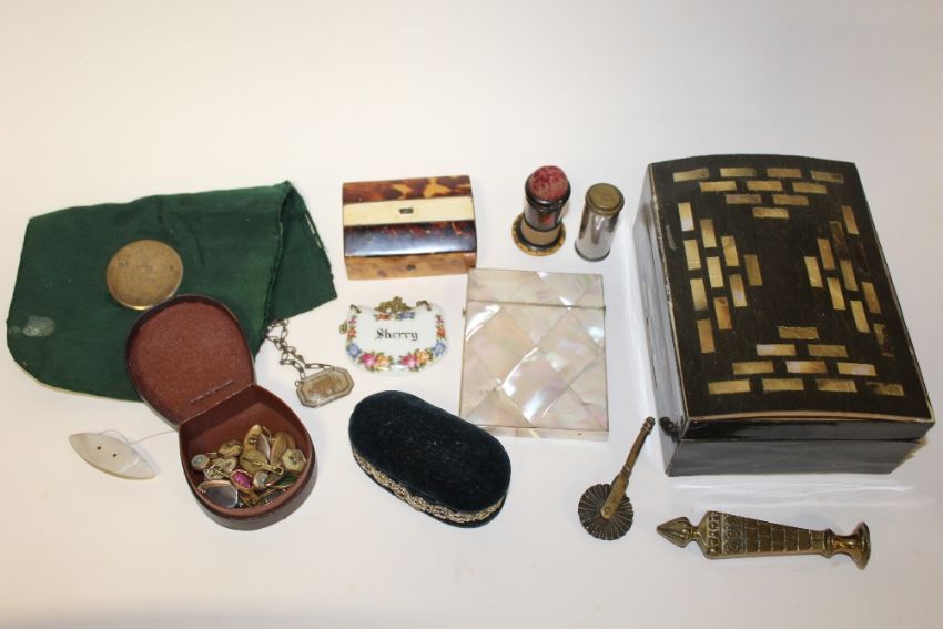 A BOX OF COLLECTABLES TO INCLUDE A MOTHER OF PEARL CARD CASE, TORTOISESHELL BOX A/F, TARTANWARE PIN CUSHION ETC.