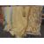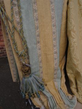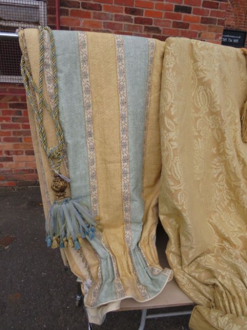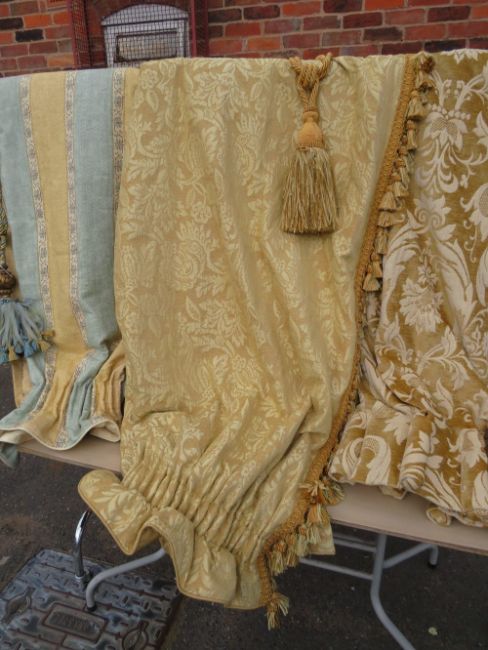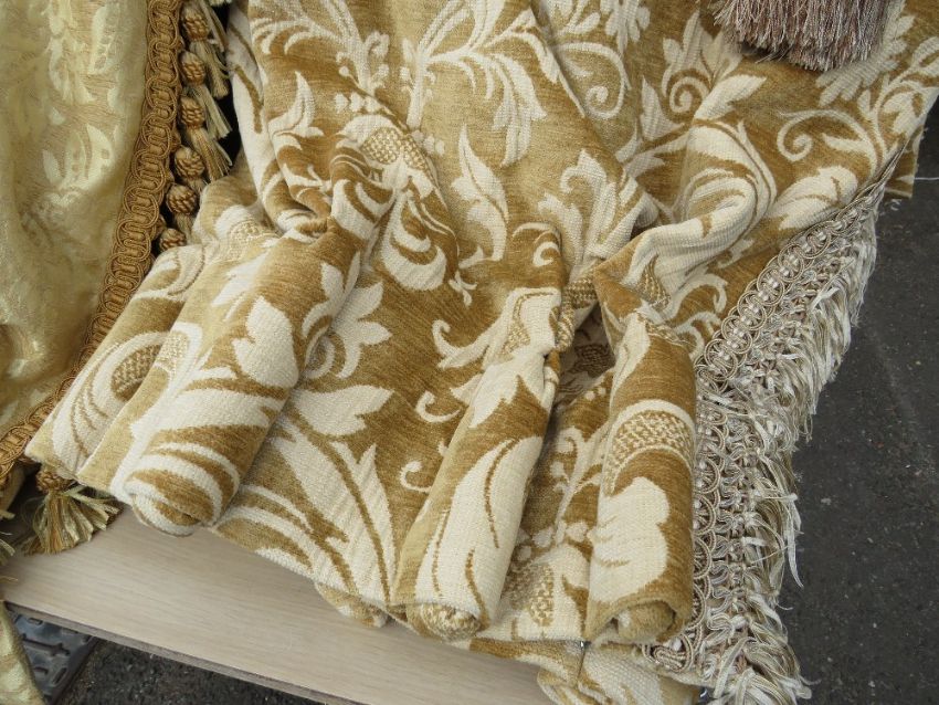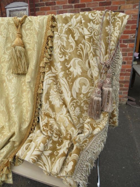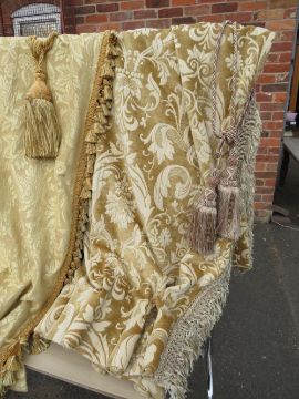 THREE QUALITY DOOR CURTAINS WITH ROPE / TASSEL TIE BACKS, COMPRISING A STRIPED LINEN EXAMPLE WITH BEADING TO ONE EDGE- INTERLINED WITH CONTRASTING LINING APPROX W 129 cm, L 197 cm TO FRILL WITH 9 cm FRILL TO TOP EDGE, A GOLD INTERLINED EXAMPLE WITH TASSELS TO ONE EDGE W 266 cm L222 cm TO FRILL WITH 11 cm FRILL TO TOP EDGE AND A VELOUR TYPE GOLD / CREAM EXAMPLE APPROX W 124 cm, L 220 cm (3)