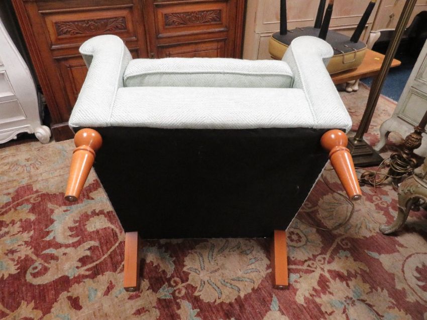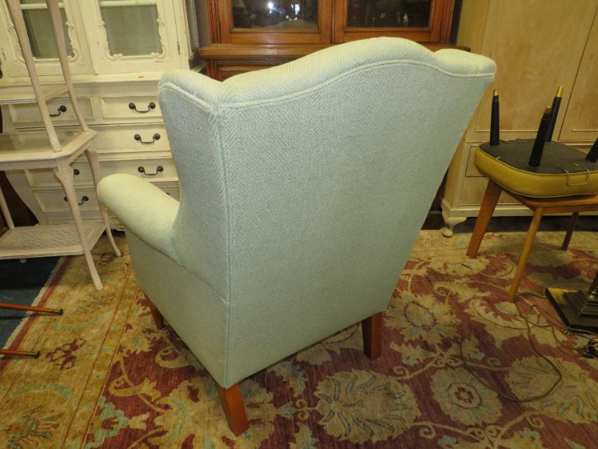 A CONTEMPORARY GREEN UPHOLSTERED WING ARMCHAIR