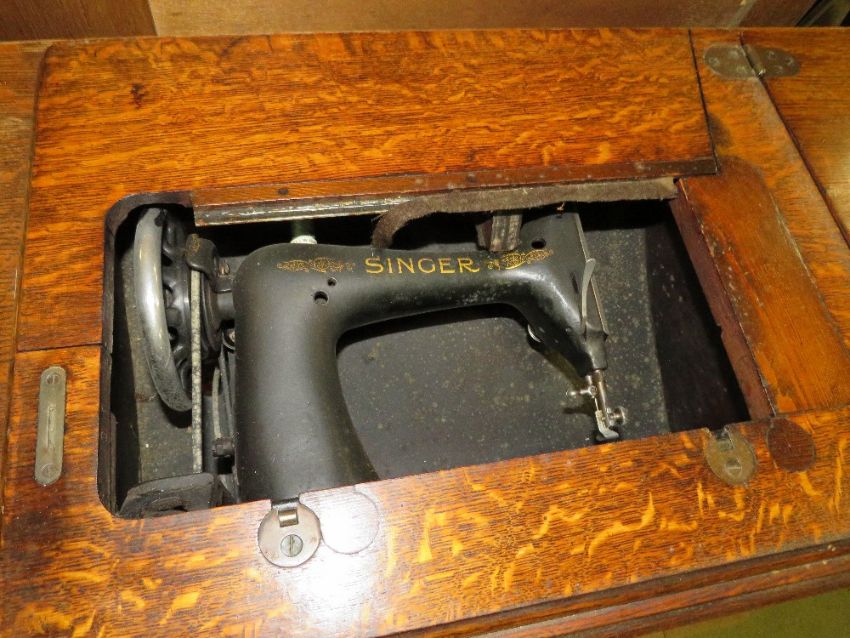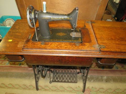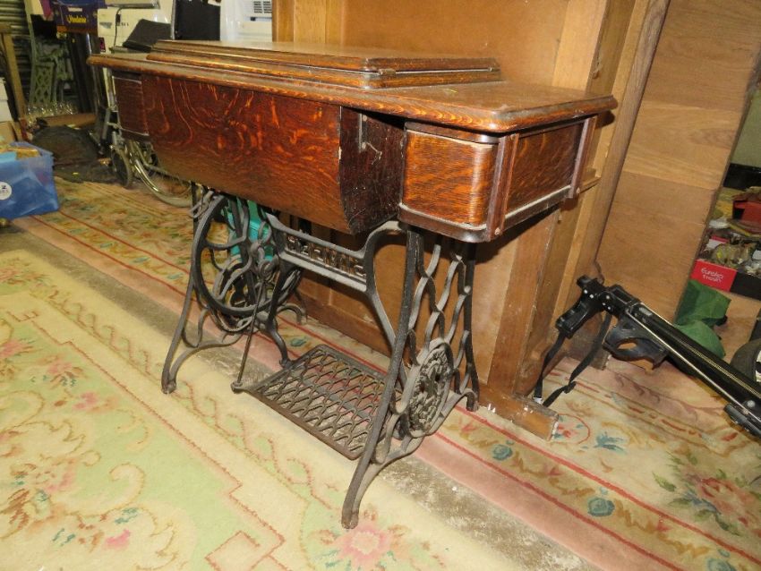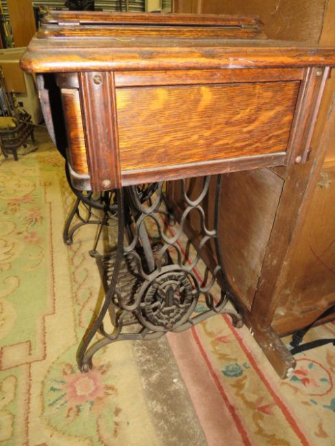 AN OAK AND CAST SINGER TREADLE SEWING MACHINE