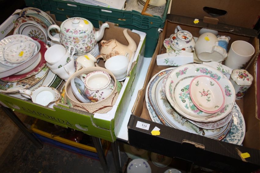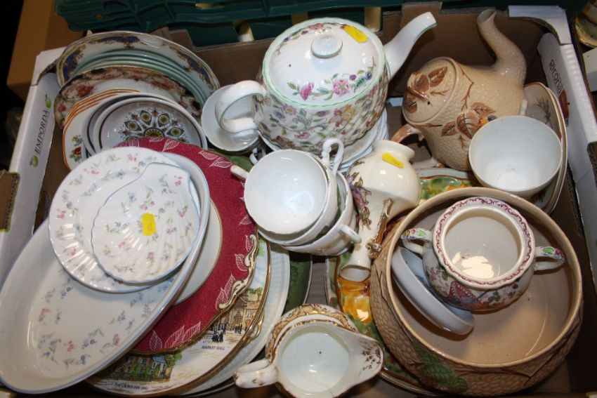 TWO TRAYS OF ASSORTED CHINA TO INCLUDE A MINTON HADDON HALL TEAPOT, ROYAL WORCESTER ETC.