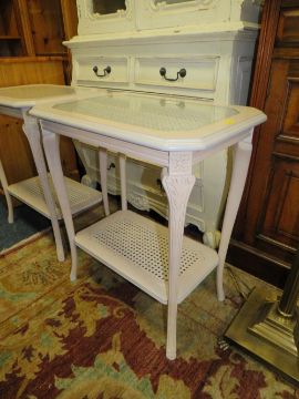 A PAIR OF SHABBY CHIC STYLE GLASS TOPPED BERGERE OCCASIONAL TABLES H-63 W-54 CM (2)