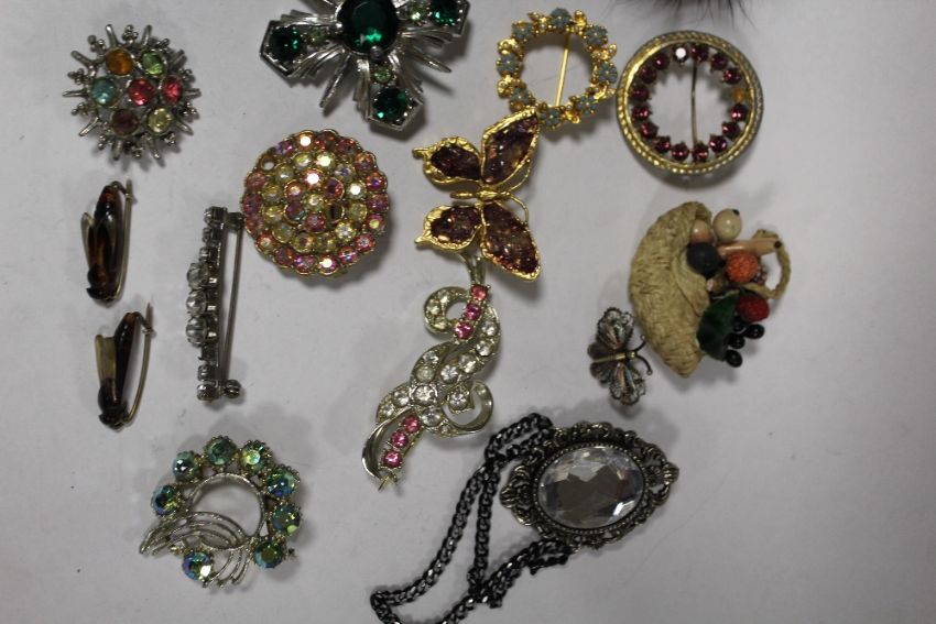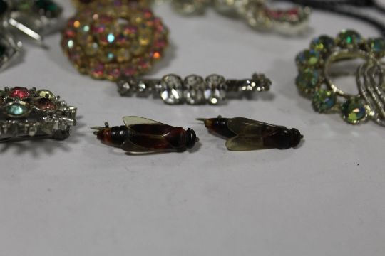 A SELECTION OF VINTAGE BROOCHES TO INCLUDE AN EASTERN STYLE SILVER AND ENAMEL EXAMPLE, BEE SHAPED EXAMPLES ETC.