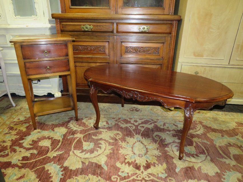 A SMALL CHERRYWOOD TWO DRAWER CABINET W-43 CM TOGETHER WITH A FRENCH STYLE COFFEE TABLE (2)