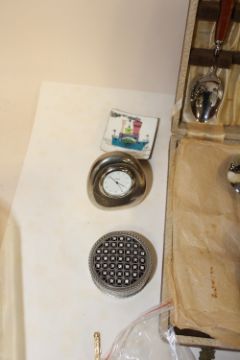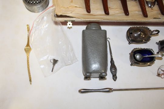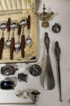 A COLLECTION OF METALWARE TO INCLUDE A HALLMARKED SILVER PERFUME FUNNEL, SILVER HANDLED BUTTON HOOK , CANTEEN OF CUTLERY ETC