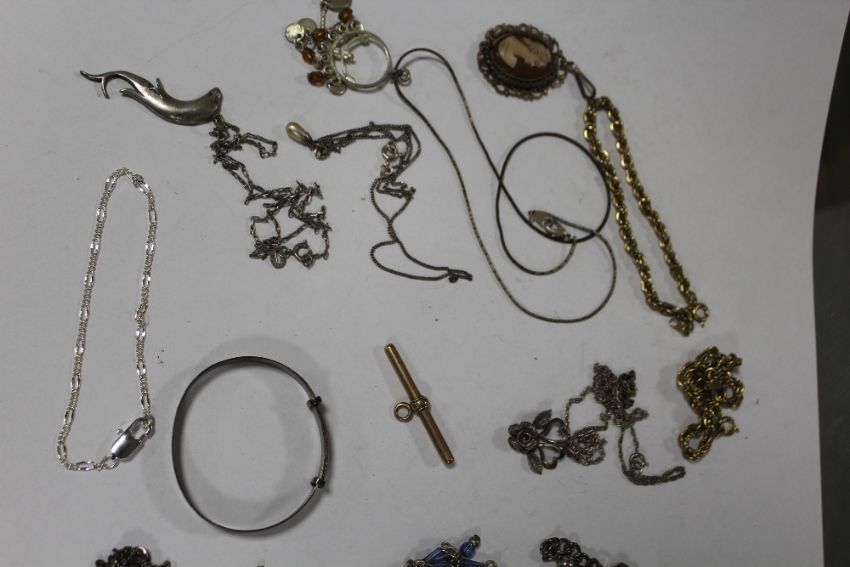 A COLLECTION OF ASSORTED JEWELLERY TO INCLUDE A SILVER CHRISTENING BANGLE, SILVER PENDANT TO INCLUDE A NOVELTY EXAMPLE IN THE FORM OF BELLOWS ETC