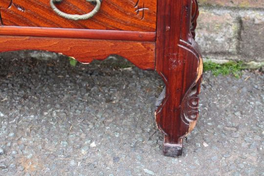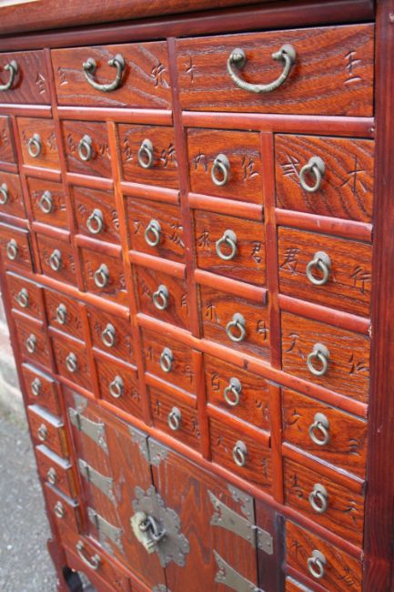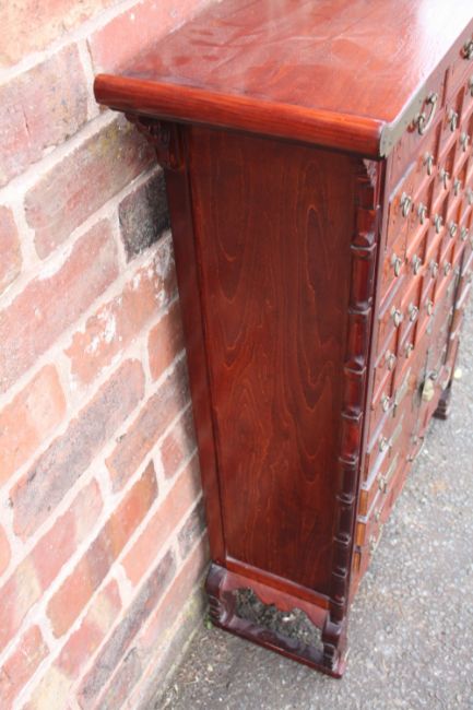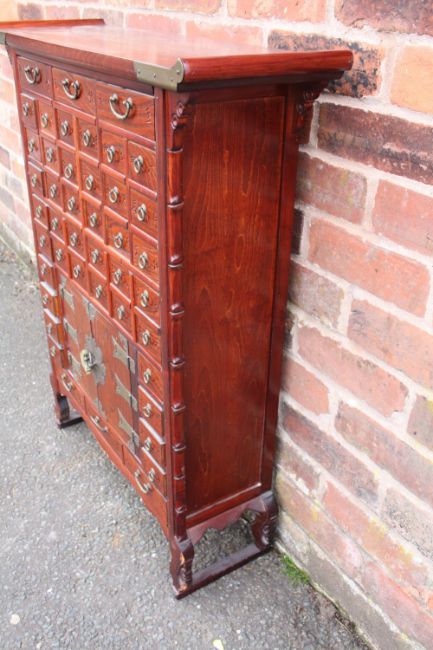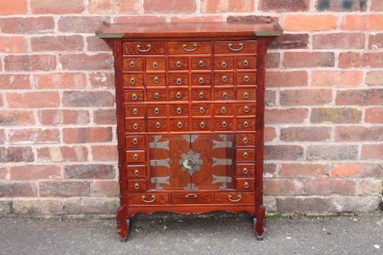 A CHINESE HARDWOOD APOTHECARY CHEST OF SLIM PROPORTIONS, having an arrangement of forty four drawers and two door cabinet, with ring turned handles and copper mounts, each drawer with incised Chinese marks, H 94.5 W 76 D 24 cm
