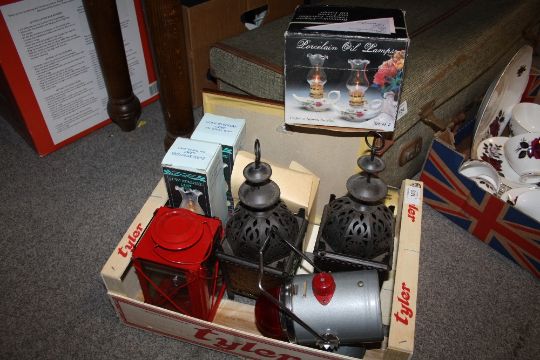 A COLLECTION OF MOSTLY MODERN LAMPS TO INCLUDE CANDLE LANTERNS WITH COLOUR GLASS PANELS, KEROSENE LAMPS, BIKE LAMP ETC.