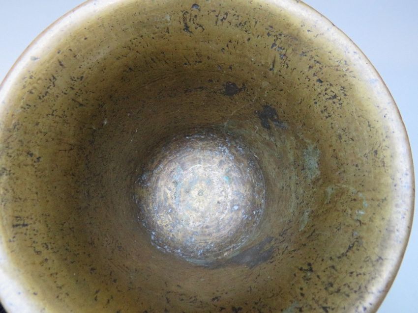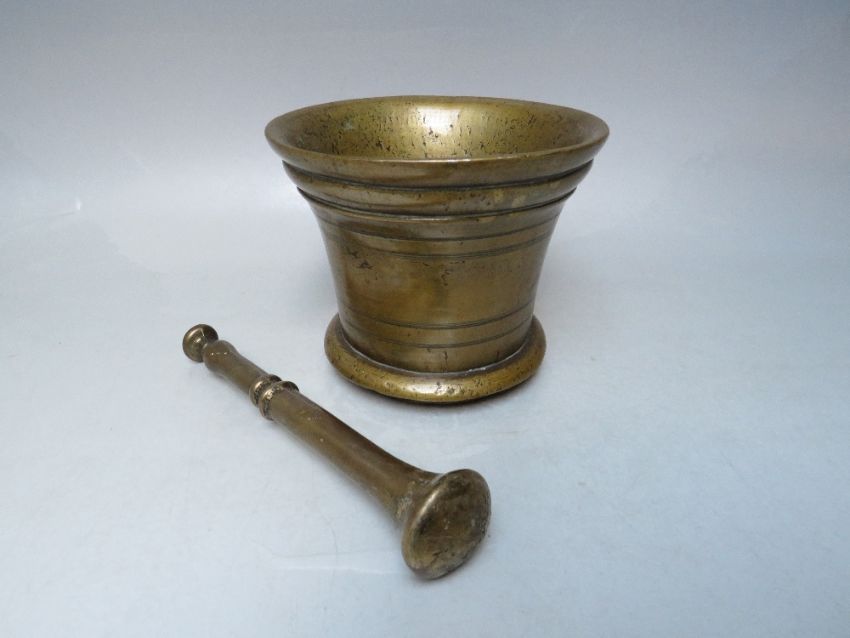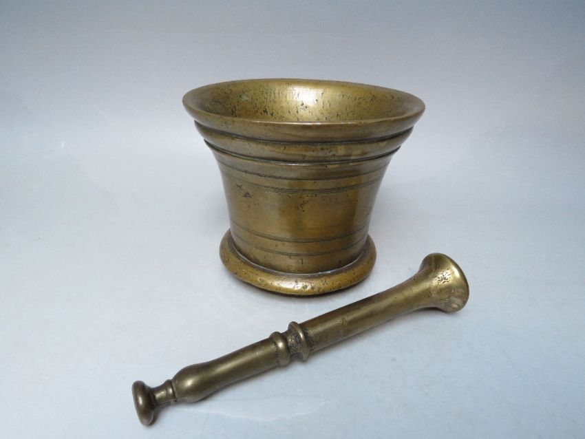 A VINTAGE HEAVY BRASS PESTLE AND MORTAR, H 12 cm, Dia. 15 cm
