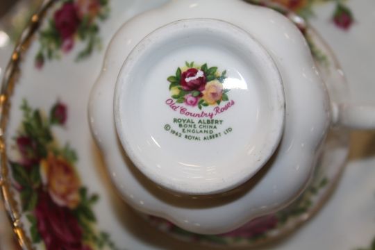 A TRAY OF ROYAL ALBERT OLD COUNTRY ROSES CHINA TO INCLUDE A TEAPOT, CUPS AND SAUCERS, EGG CUPS, DINING PLATES ETC. NOTE- WEAR TO GILDING ON SOME PIECES