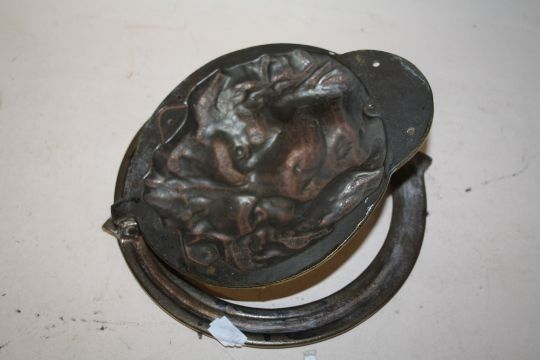 A LARGE BRASS LION'S HEAD DOOR KNOCKER, OVERALL WIDTH 21 CM