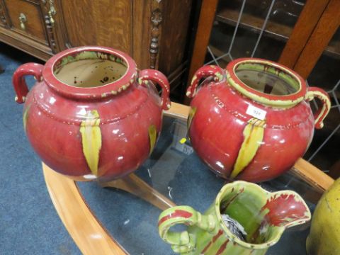 A PAIR OF GLAZED TWIN HANDLED VASES H 31 CM TOGETHER WITH ANOTHER SIMILAR JUG AND ANOTHER VASE (4)