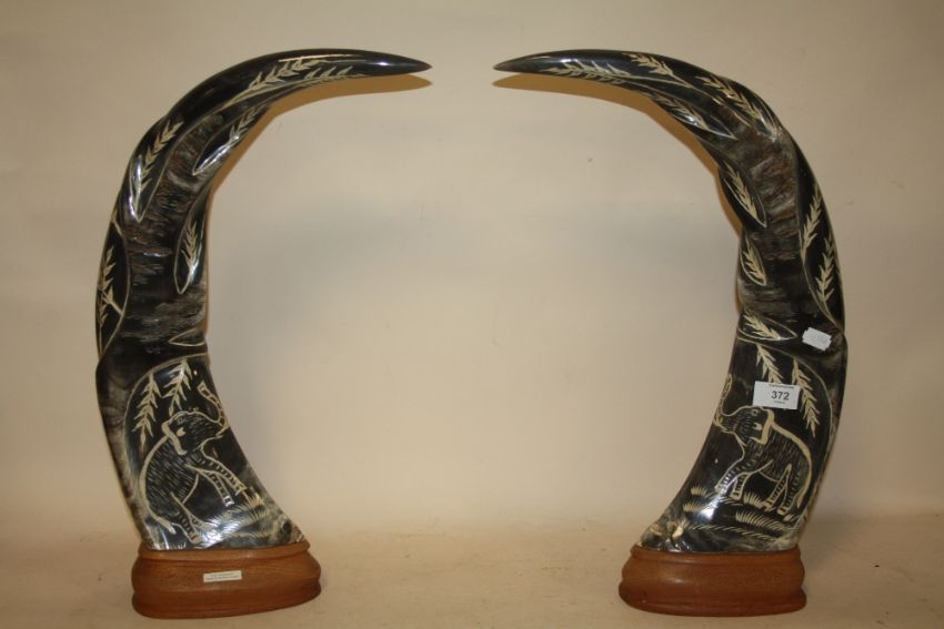 A PAIR OF LARGE CARVED BUFFALO HORNS ON WOODEN PLINTHS, H 48 CM