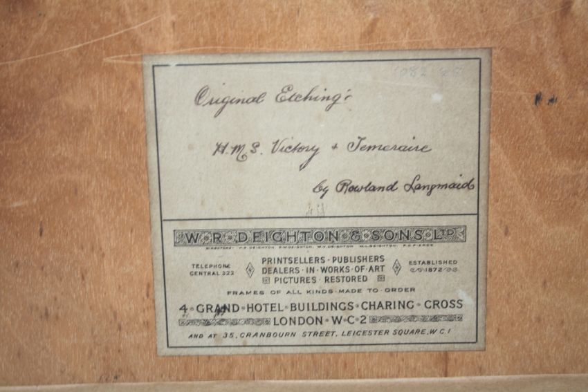 ROWLAND JOHN ROBB LANGMAID (1897-1956). 'H.M.S. Victory & Temeraire' see label verso, signed in pencil lower right, etching on paper, framed and glazed, 32 x 22 cm