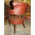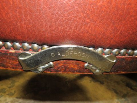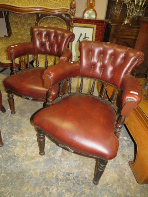 A SET OF THREE EARLY 20TH CENTURY OAK LEATHER TUB ARMCHAIRS WITH UNUSUAL PLATED NAME PLAQUES TO THE FRONT
