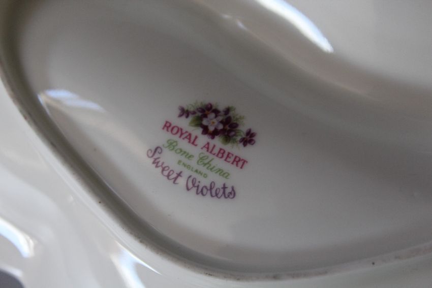 A COLLECTION OF ROYAL ALBERT 'SWEET VIOLETS' PATTERN DECORATIVE BONE CHINA, to include a shell shaped dish and small comport H 7.5 cm D 16 cm, together with retail division conference bud vase in the form of a s 'pottery chimney', H 9.5 cm, etc. (11)