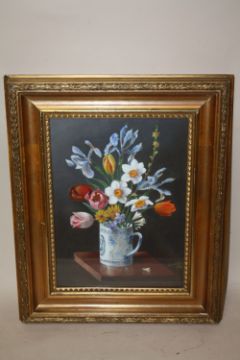 A GILT FRAMED AND GLAZED STILL LIFE OIL PAINTING OF FLOWERS IN A MUG SIGNED W. BADILELLEY LOWER RIGHT 30CM X 22CM