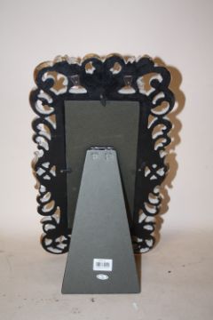 A MODERN EASEL-BACK TABLE TOP MIRROR WITH GILT PIERCED FRAME, OVERALL H. 41 CM, W. 25 CM