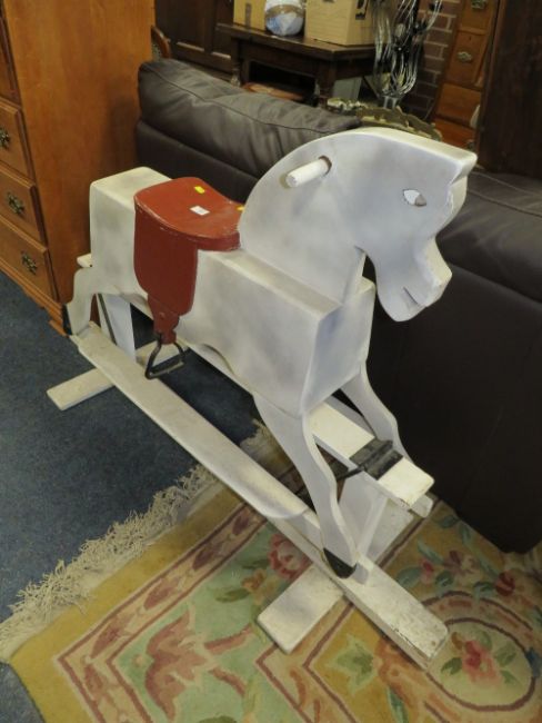 A WOODEN CHILDS TRESTLE ROCKING HORSE