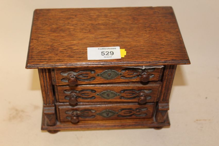 AN OAK JEWELLERY BOX IN THE FORM OF A THREE DRAWER CHEST OF DRAWERS CONTAINING COSTUME JEWELLERY