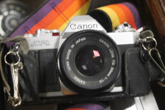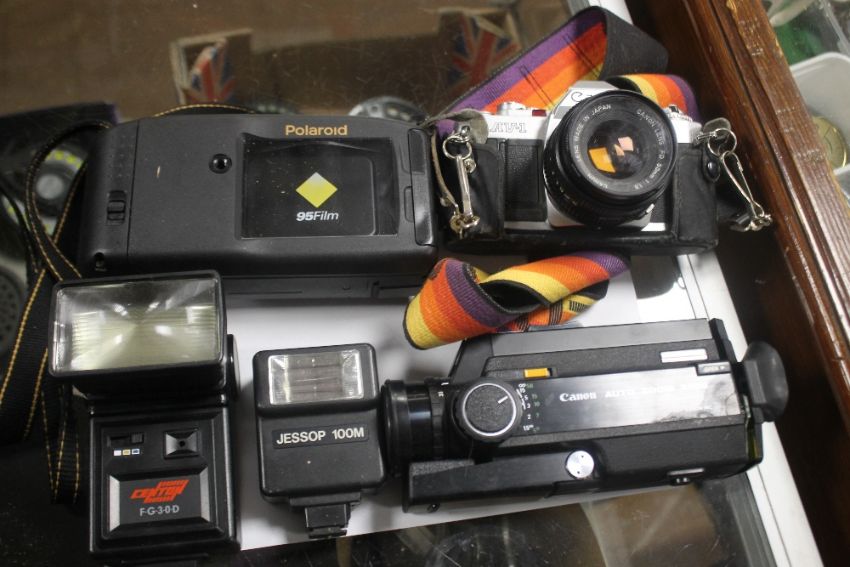 A TRAY OF ASSORTED CAMERAS to include Poloroid etc. together with other collectables
