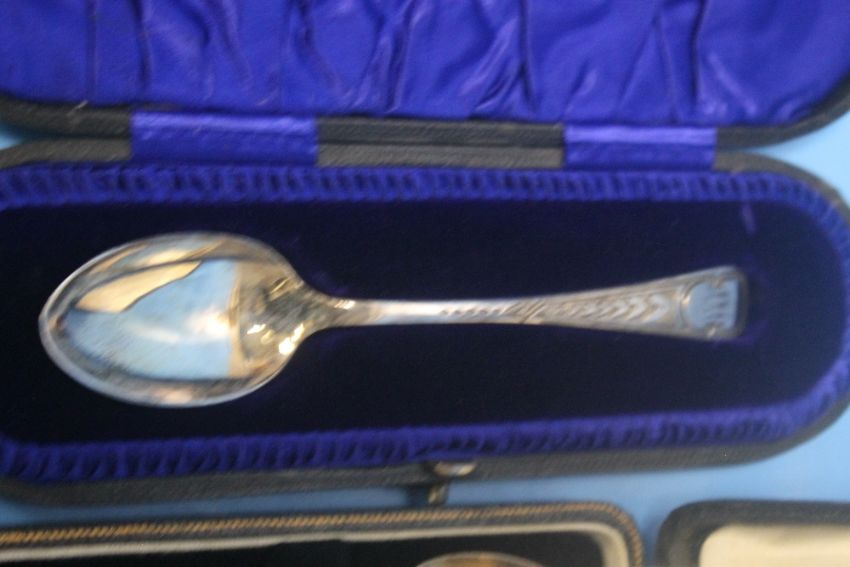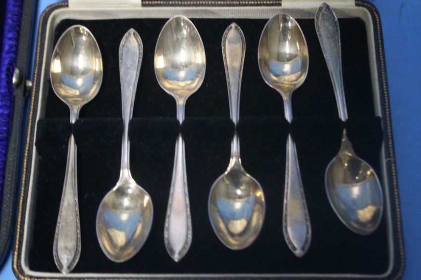 A CASED SET OF HALLMARKED SILVER TEASPOONS together with another cased spoon