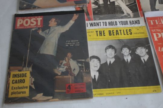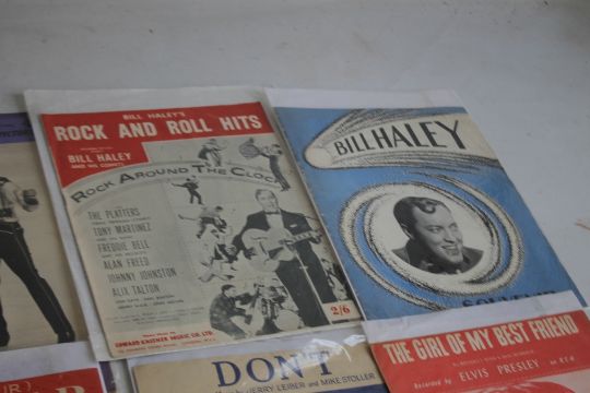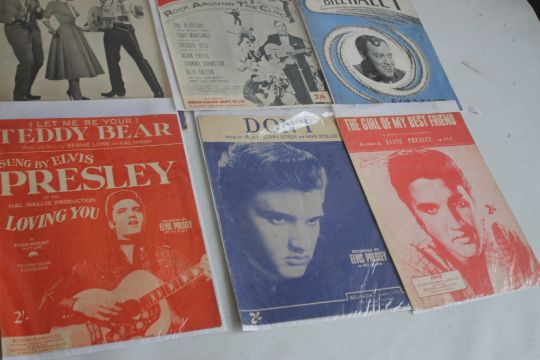 MUSIC MEMORABILIA 1950S / 1960S to include Beatles sheet music "I Want To Hold Your Hand", "Bill Haley Souvenir", "Bill Haley's Rock and Roll Hits sheet music for "Rock Around The Clock", Elvis Presley sheet music "The Girl of my Best Friend", and 'Teddy Bear',"Picture Show & Film Pictorial" magazine August 1957 with Elvis "Loving You" cover, "Picture Show & Film Pictorial" magazine October 1957 with competition to win Elvis's shirt, "Picture Post " December 1956 with Pat Boone cover and "Pictures Post" March 1957 with Tommy Steele cover (9)