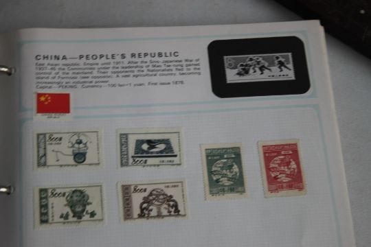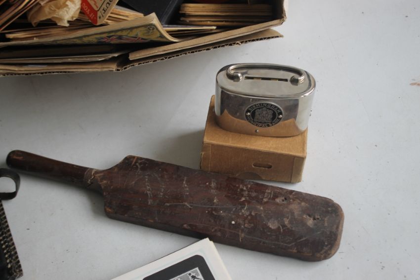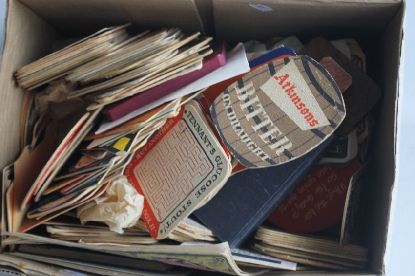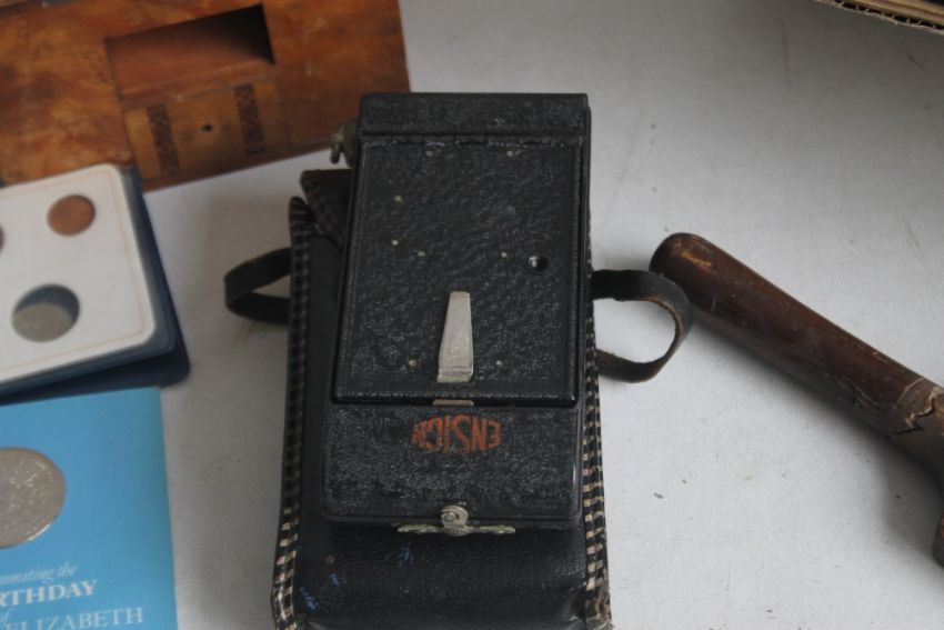 A CASED FOLDING ENSIGN CAMERA TOGETHER WITH A BOXED "BIRMINGHAM MUNICIPAL BANK" MONEY BOX AND A WOODEN CIGARETTE BOX ETC, together with a box of beer mats and a stamp album contents