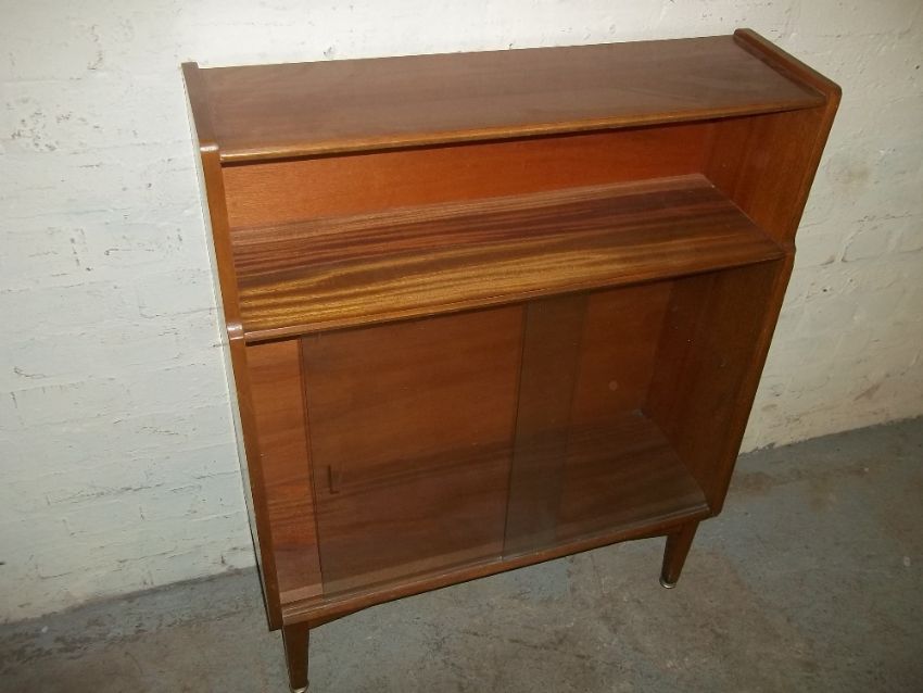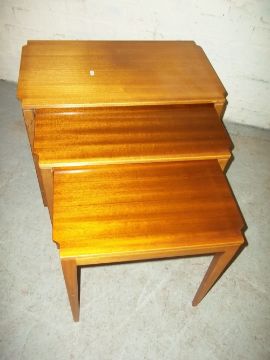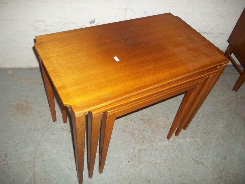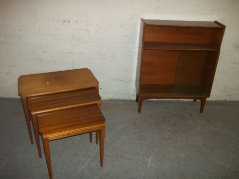A SAPELE / MAHOGANY DISPLAY BOOKCASE WITH SLIDING GLASS DOORS AND A NEST OF TABLES