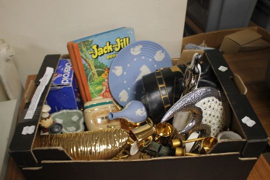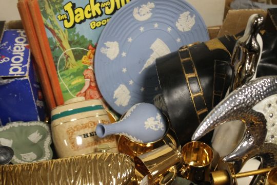 A BOX OF ODDMENTS TO INCLUDE PART CROWN DEVON TEA SET, THREE WEDGWOOD ITEMS, OLD COUNTRY ROSES, ROYAL DOULTON, POLOROID CAMERA ETC.