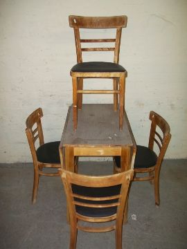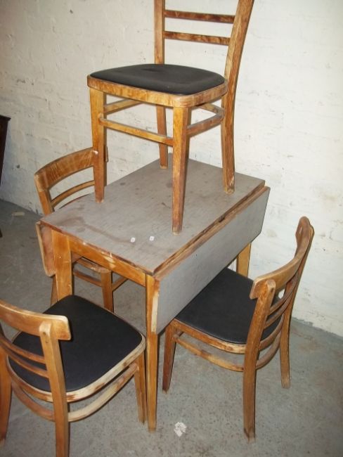 A VINTAGE DROP LEAF FORMICA KITCHEN TABLE AND FOUR CHAIRS